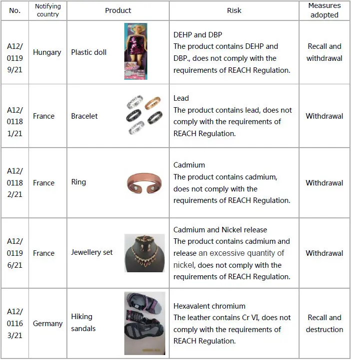1) 10 cases of products that do not comply with the requirements of REACH were notified. Following are the detail information and part of examples.